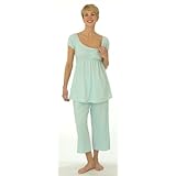 This comfortable empire styled PJ has a stretch elastic neckline for easy nursing access. It is comfortable to sleep in or wear all day. Wear it during and after your pregnancy. Capri length pants (24" inseam) with side slits at the bottom of the leg opening.